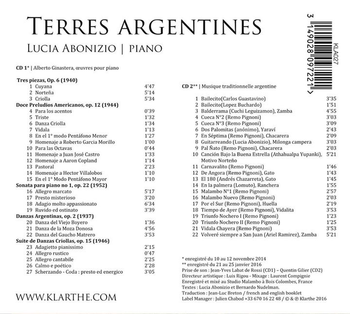 A l’occasion du centenaire de la naissance du compositeur argentin Alberto Ginastera, la pianiste Lucia Abonizio sortira un double album « Terres Argentines », Il est consacré aux œuvres pour piano de Ginastera et la musique traditionnelle argentine sur laquelle Ginastera a puisé son inspiration.