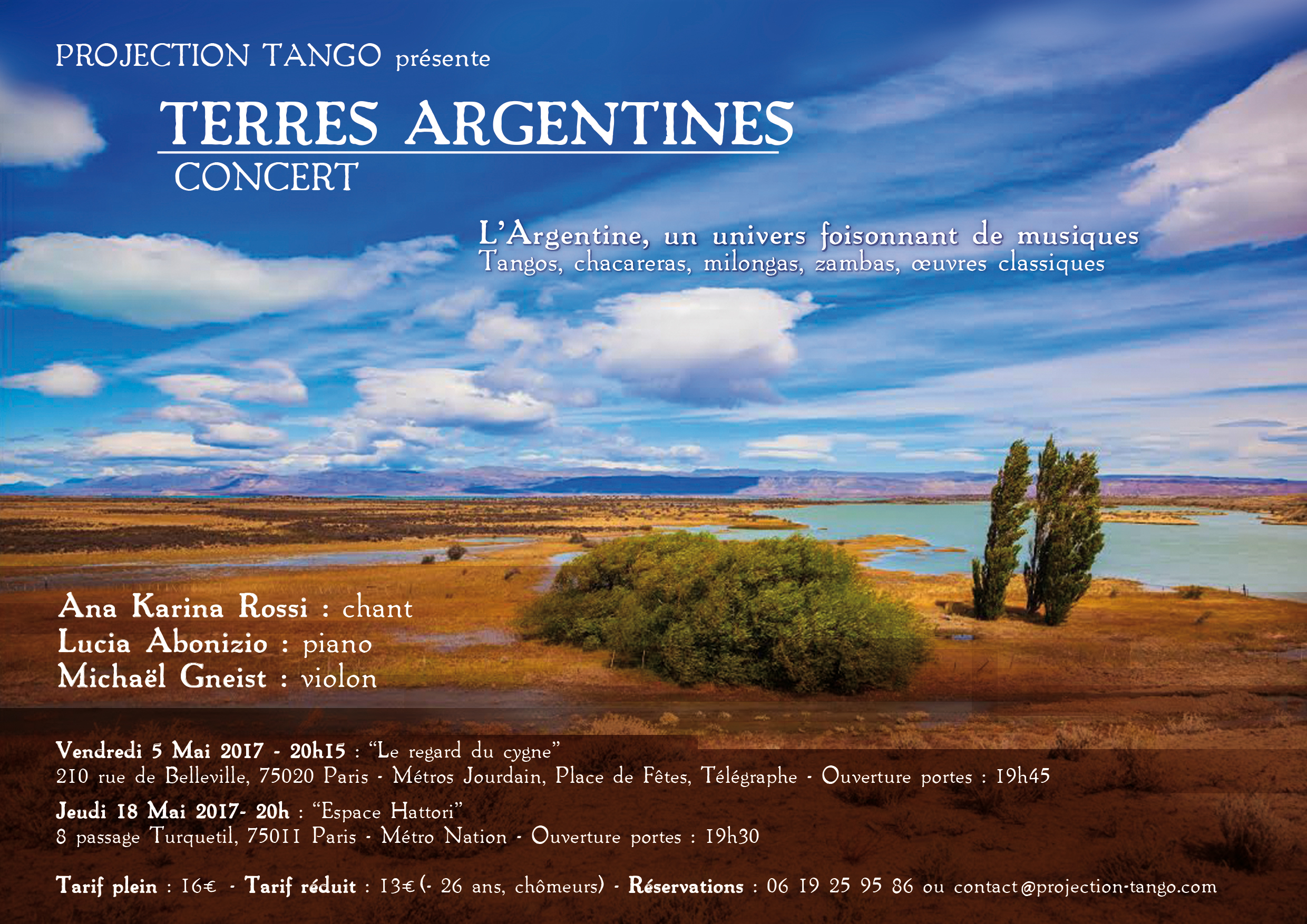 « La pianiste argentine Lucia Abonizio et le ténor Gilles San Juan vous donnent rendez-vous pour un récital florilège réunissant des musiques traditionnelles issues de la campagne argentine et le tango né au port de Buenos Aires. Une fenêtre ouverte sur les origines et l’évolution de ces musiques par le biais des compositeurs phares comme Carlos Guastavino, Alberto Ginastera, Mariano Mores et Astor Piazzolla entre autres… »