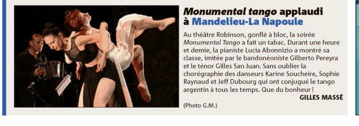 ns le cadre du festival « C’est pas classique », concert EXCEPTIONNEL du trio « MONUMENTAL TANGO » avec la pianiste argentine Lucia Abonizio, le bandonéoniste argentin Gilberto Pereyra et le ténor franco-espagnol Gilles San Juan.